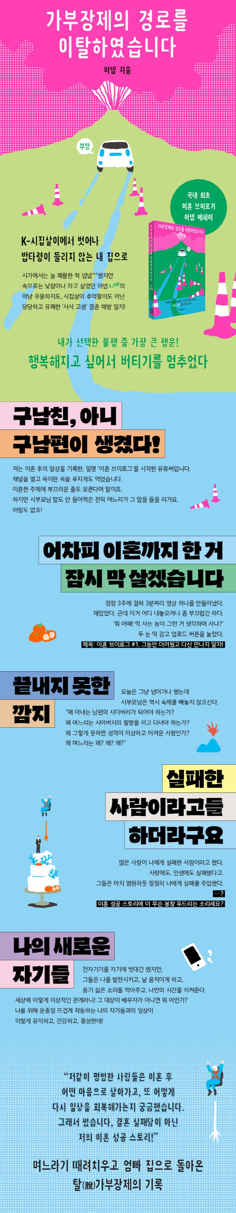 저자는 ‘한 번 다녀온’ 경력을 바탕으로 마냥 우울하지도, 시집살이 추억팔이도 아닌, 스스로 상처를 회복하고 극복해나가는 과정을 제주에서의 소박한 일상과 함께 솔직하고 위트 있게 풀어낸다. 인터넷에 넘쳐나는 망한 결혼 이야기가 아니라 평범한 사람의 이혼 성공 스토리를 담아낸 이 책이 위태롭게 가부장제의 경로에서 괴로워하는 사람들에게 회복의 알약이 되어주길 바란다.