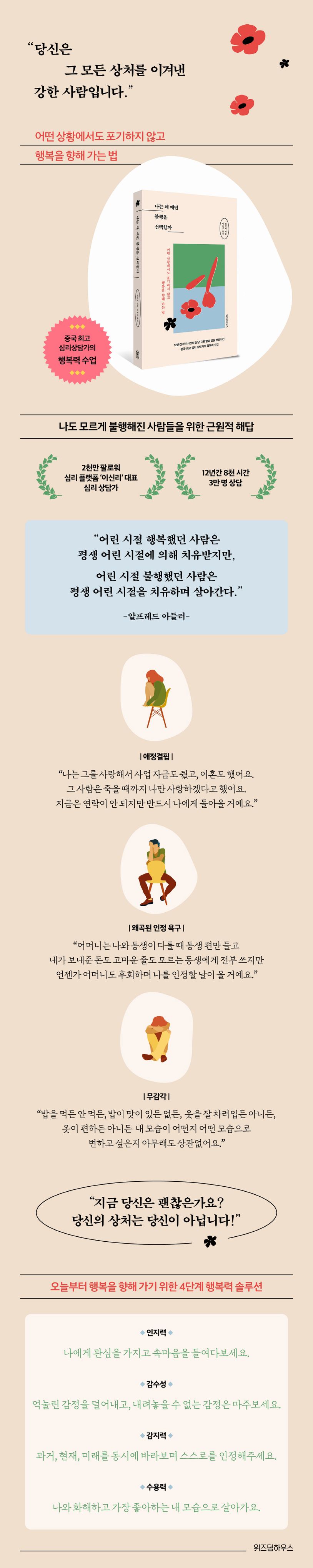 중국 최고의 상담 자격증을 가진 국가 공인 전문 심리상담가 러진웨는 우리가 행복해지기 위해서는 ‘행복력’이 필요하다고 강조한다. 마음을 성장시키고 앞으로 나아가도록 이끄는 힘인 행복력을 갖고 있으면 과거의 상처에 얽매이지 않고 미래를 향해 눈을 돌릴 수 있으며, 이 힘을 통해 자신의 인생을 지배할 수 있기 때문이다. 살아가면서 마주치게 되는 다양한 심리적 문제에 대해 근본적인 해결책을 찾도록 안내하는 이 책을 통해 누구나 ‘나’를 중심으로 하는 사고력과 문제 해결력을 키울 수 있으며, 어떤 상황에서도 행복을 누릴 수 있는 사람이 될 수 있다.