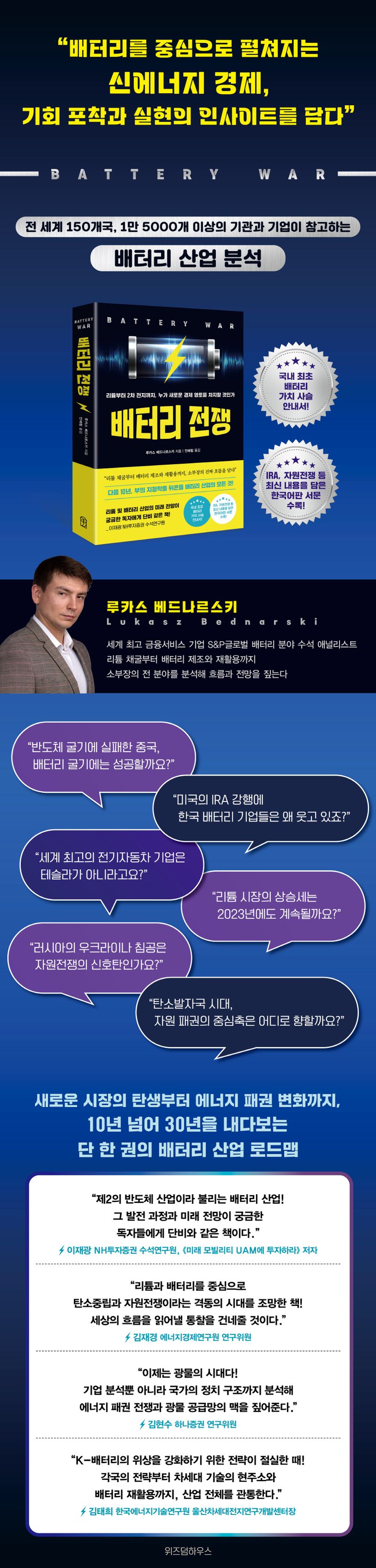 이모든기회의밑바탕에는세계각국이2050년을목표로진행중인탄소중립정책이있다.지금까지풍력이나태양열같은재생에너지는저장할수없다는치명적인단점때문에널리쓰이지못했다.하지만2차전지가개발되며그한계를극복했고,꾸준한성능개량으로재생에너지를상업적으로이용할수있는단계에이르렀다(11~13쪽).혹자는전기자동차를예로들며배터리에충전되는전기대부분이여전히화석연료를태워만든다고비판한다.하지만산업전체의이산화탄소배출량을살펴보면,전기자동차를타는게내연기관차를타는것보다이미훨씬친환경적이다(252~256쪽).결국배터리산업은탄소중립실현을위한첫걸음일수밖에없다.