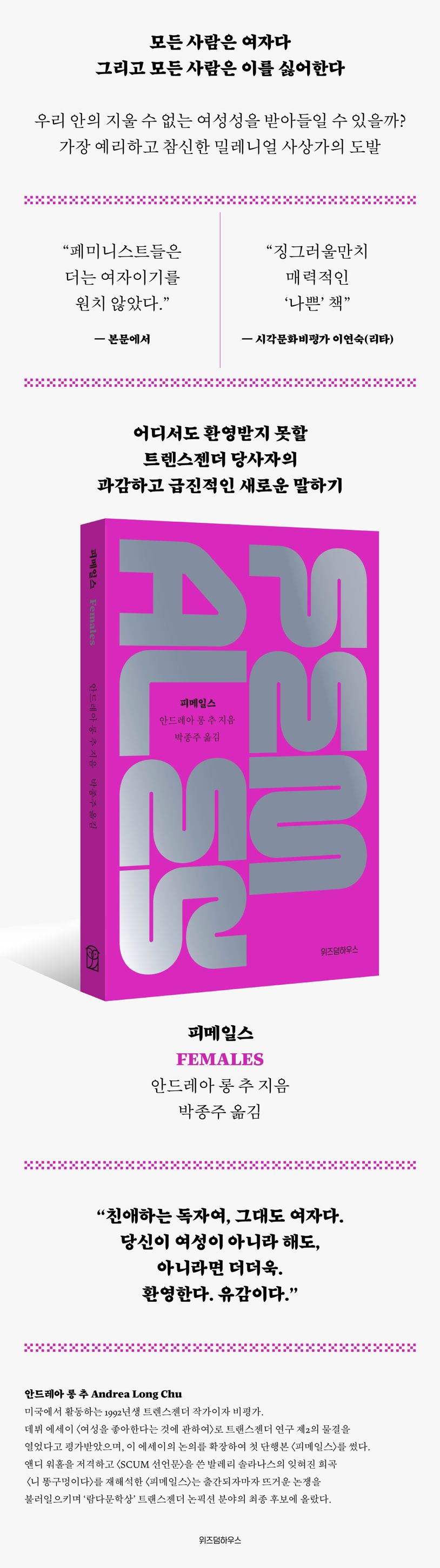 《피메일스》는 바로 이 조악하고 선정적이며 너무도 노골적으로 부적절해 보이는 솔라나스의 걸작 〈니 똥구멍이다〉를 재해석한다. 각 장의 제목으로 〈니 똥구멍이다〉의 대사를 붙인 이 책은 젠더 스터디 분야 필독서로 널리 읽히는 롱 추의 데뷔 에세이 〈여성을 좋아한다는 것에 관하여On Liking Women〉를 확장한 첫 단행본으로, 출간과 동시에 뜨거운 논쟁을 불러왔다. 병적이고 부정적인 실존 상태로서의 ‘여성성femaleness’을 옹호하며 트랜스 페미니즘 연구에 새로운 바람을 일으킨 《피메일스》는 2019년 LGBT 문학계의 노벨문학상이라 불리는 람다문학상 트랜스젠더 논픽션 분야 최종 후보에 올랐다.