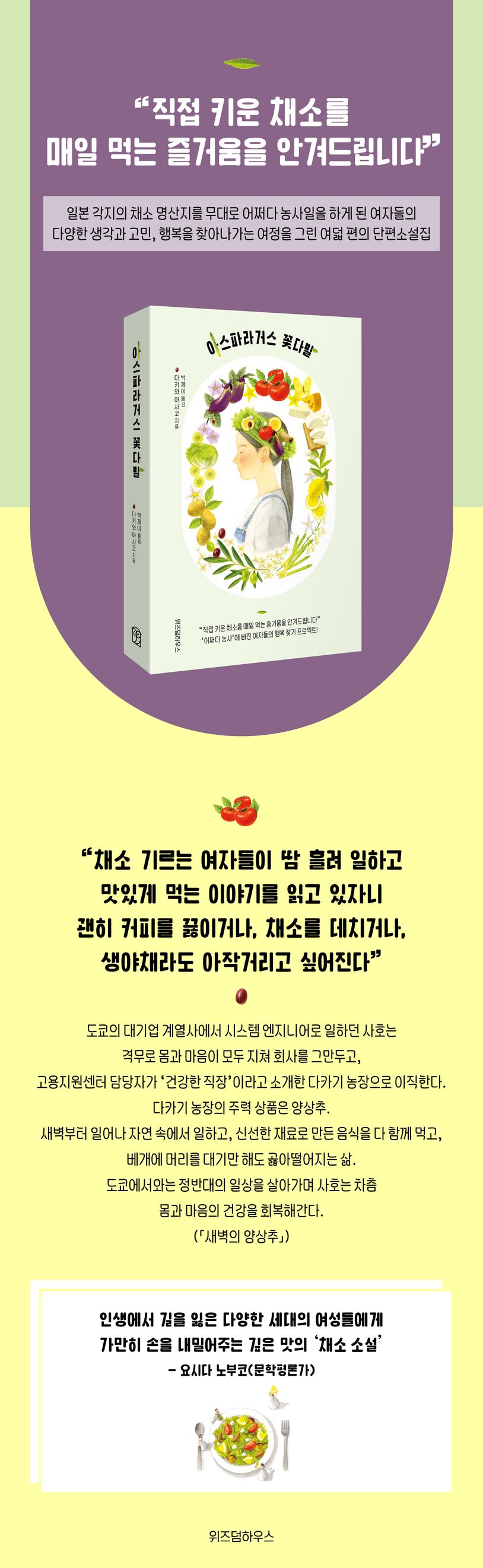 일본 각지의 채소 명산지를 무대로 어쩌다 농사일을 하게 된 여자들의 다양한 생각과 고민, 행복을 찾아나가는 여정을 그린 여덟 편의 단편소설집. 따스한 햇볕, 달콤쌉싸름한 흙내음, 신선한 채소와 어우러진 여러 인물들의 아름다운 사연을 그리고 있는 이 소설은 군마의 양상추, 오카야마의 가지, 홋카이도의 감자, 나가사키의 아스파라거스, 와카야마의 레몬, 이와테의 치즈, 가가와의 올리브, 이시카와의 토마토…처럼 따뜻하고 깊은 맛을 내는 ‘채소 소설’이다.