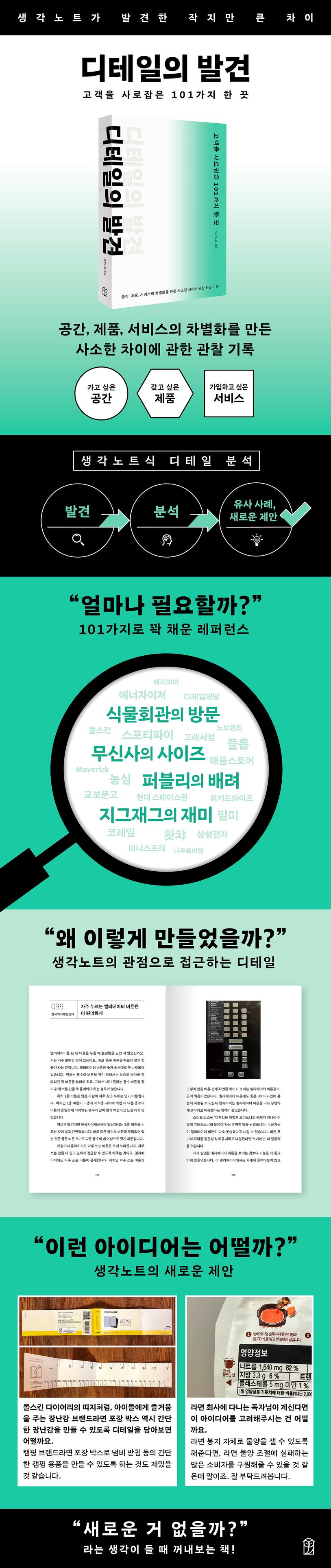 기록광으로 소문난 생각노트는 기획안을 쓰거나 회의를 준비할 때 꺼내 보는 비밀 폴더가 있다. 평소에 “오 이거 좋은데?”라는 생각이 들었던 아이디어를 모아둔 사진첩이다. 생각의 전환이 필요할 때 이 폴더를 열어서 발견 당시 느꼈던 신선한 감동을 떠올리며 기획과 발표에 참신함을 더한다. 생각노트는 비밀 폴더에서 독자들과 나누고 싶은 101가지를 선별해 신간 《디테일의 발견》에 담았다. 부산 시장 골목의 작은 가게부터 성수동의 힙한 브랜드, 거대 IT 기업까지 다양한 상황에서 고객의 마음을 사로잡은 디테일의 비밀은 무엇일까? 기획자, 마케터, 디자이너, 크리에이터, 자영업자 등 고객을 사로잡아야 하는 모든 이에게 새로운 영감을 줄 수 있을 것이다.