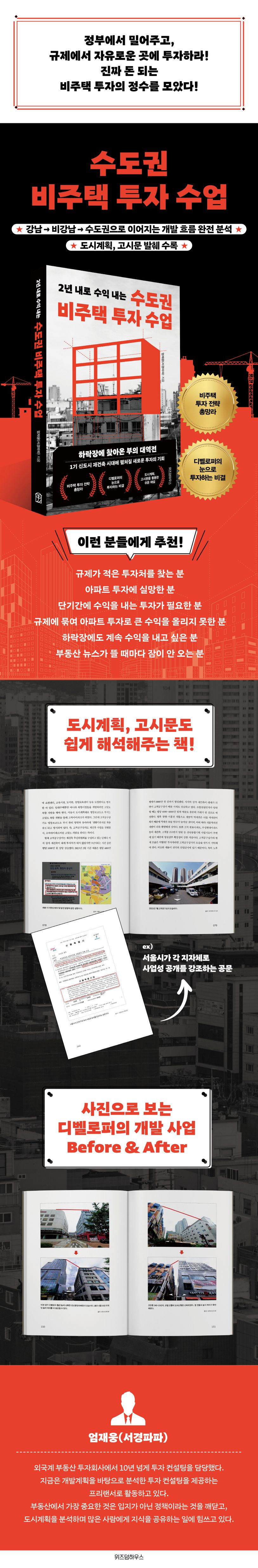 엄재웅 저자가 진짜 개발이 될 부동산을 독자들에게 알려주는 신간 《수도권 비주택 투자 수업》을 출간했다. 이 책은 정부의 고시문과 도시계획 원문을 활용해서 부동산 투자의 방향을 잡는 방법과 앞으로 유망한 투자처를 담고 있다. 우리가 흔하게 보는 노후 아파트 단지의 상가부터 준공업지역의 연립주택, 상업지역의 구분상가 등 다양한 투자 기회를 소개한다. 더불어 모텔 리모델링 투자 사례와 국가의 미래 사업인 산단 대개조 사업을 수록했다.