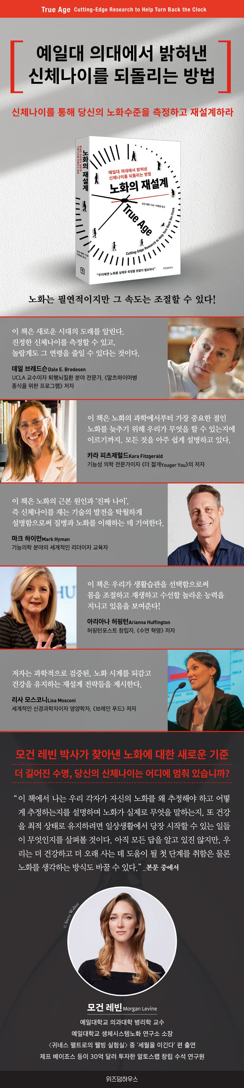 우리는 누구나 늙는다. 즉 노화 자체는 필연적이라는 말이다. 하지만 우리가 늙는 방식까지 정해져 있지는 않다. 예일대학교 의대에서 노화를 연구해온 모건 레빈 박사는 우리가 노화의 어떤 경로에 있고 얼마의 속도로 가고 있는지를 알 때 늙는 방식을 재설계할 수 있다고 주장한다. 즉 자신의 현재 상태를 객관적으로 정확하게 측정할 때 자신에게 딱 맞는 재설계가 가능하다는 것이다. 레빈 박사는 노화에 대한 객관화 방안 연구를 통해 찾아낸 ‘신체나이’를 바탕으로 노화에 대한 접근방식과 이에 대응하는 방법을 새롭게 제시한다. 더 건강하게 오래 사는 첫 단계이자 노화를 생각하는 방식 자체를 완전히 바꿀 ‘재설계 전략’을 알려준다.