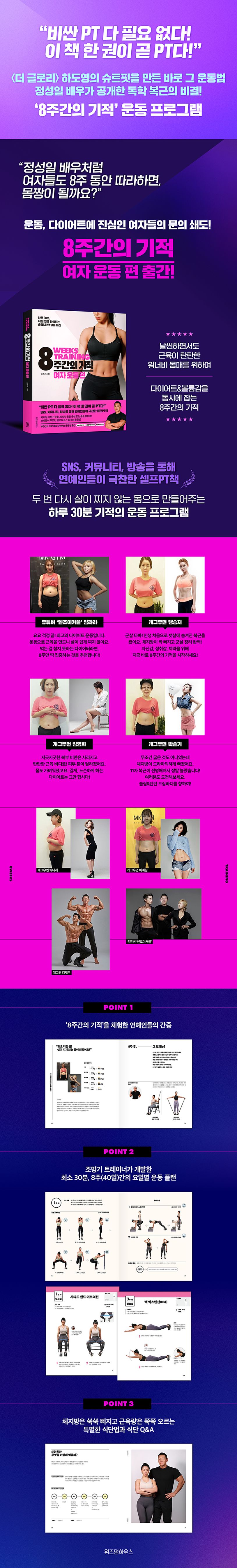 수많은 연예인들의 몸을 명품 바디로 새롭게 디자인하는 스타 트레이너, 조명기의 ‘8주간의 기적’ 운동법을 담은 두 번째 책. 2017년에 출간한 첫 번째 책 『8주간의 기적 근육의 부활』이 남자 근육에 맞춘 운동법이었다면 이번 『8주간의 기적 여자 운동 편』은 평생 살 빼기에 진심인 여자들, 운동에 미친 일명 '쇠질하는 여자'들을 위한 운동법이다. 체지방은 덜어내고 슬림하면서도 탄탄한 근육을 입혀주는 '하루 최소 30분, 8주 요일별 운동법&식단'을 담았다.