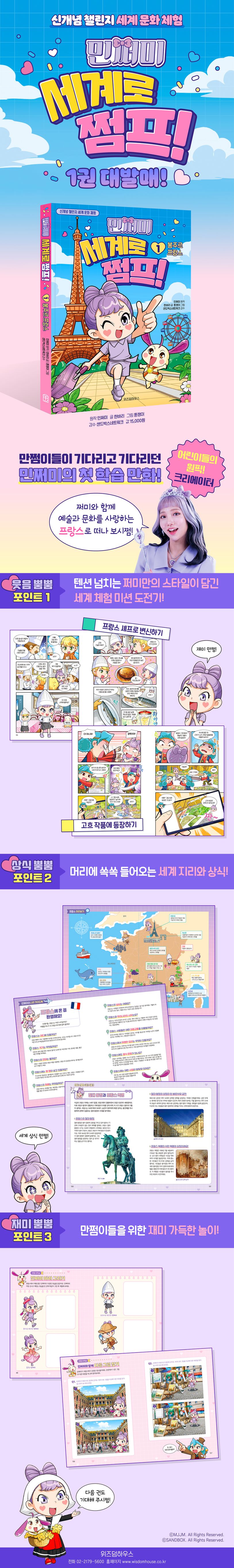 이번 첫 권에서는 예술과 문화를 사랑하는 나라인 프랑스로 떠난다. 파리의 에펠 탑 등 각 도시의 랜드마크에서 흥미진진한 이야기가 펼쳐진다. 재능 부자 민쩌미의 매력이 발산되는 장면과 쩌미만의 스타일로 미션을 해결하는 웃음 포인트가 있다. 책을 술술 읽다 보면 프랑스의 기본 상식은 물론이고 대표적인 음식, 역사, 인물에 관한 지식까지 폭넓게 익힐 수 있을 것이다.