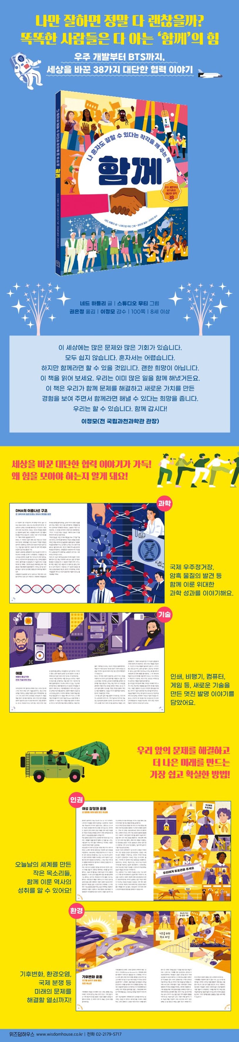 “혼자 하면 편한데 왜 같이 해야 해요?” 아이가 이렇게 질문한다면 어떻게 대답할 수 있을까? 이 책에 그 답이 있다. 《함께》는 여럿이 힘을 합쳐 최고의 자리에 오르고, 소중한 생명을 구하며, 세상을 바꾼 위대한 발견을 해낸 사람들의 실제 이야기를 담은 책이다. 왜 협력해야 하는지를 직접 설득하기보다 우리가 힘을 합치면 어떤 일을 할 수 있는지를 보여 줌으로써 협력의 힘을 실감할 수 있게 했다.