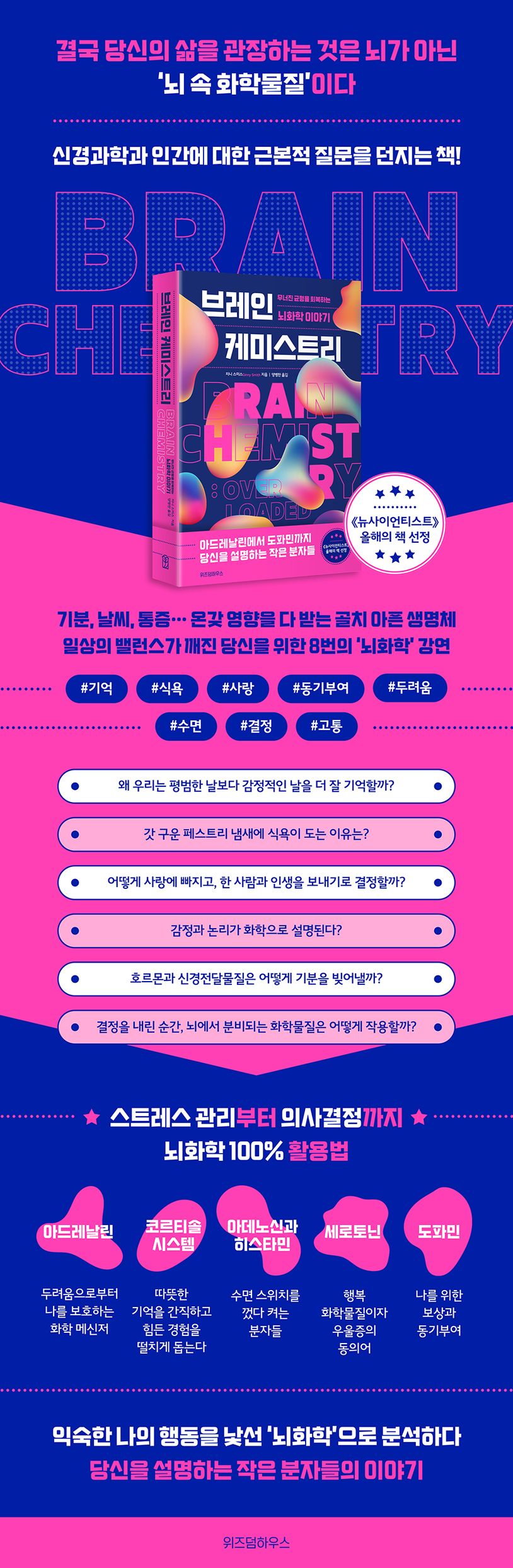 매일 우리가 내리는 찰나의 결정, 시시각각 달라지는 감정, 직면하는 유혹, 관성적 행동은 어떻게 이루어질까? 그 안에는 느리게 변하는 뇌 자체가 아닌, 뇌 내에 분비되는 호르몬과 신경전달물질의 활약이 숨어 있다. 이 책은 아드레날린, 세로토닌, 도파민, 옥시토신 등 한번쯤 들어보았을 신경전달물질의 네트워크 이야기, 처음 만나는 뇌화학 수업이다. 작은 화학물질들이 정확히 어떤 기제로 움직여, 고유한 나를 형성해나가는지 살펴본다. 이때 뇌를 구성하는 세포도 중요하지만 내 일상의 모든 순간에 직접 관여하는 것은 뇌세포를 적시고 뉴런 간 의사소통을 가능하게 하는 각종 화학물질이다.
