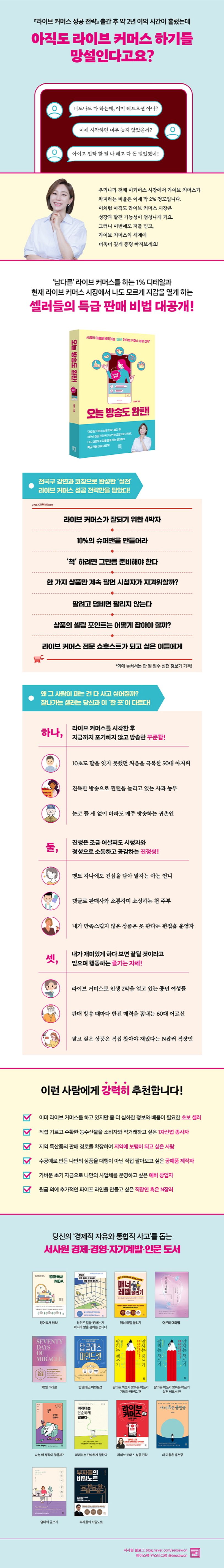 직접 생산하거나 만든 상품을 가장 효율적으로 파는 가장 좋은 방법이 라이브 커머스임을 알면서도 아직 라이브 커머스를 할 용기가 나지 않는 1차 산업 및 제조업 종사자, 월급 외의 파이프라인을 만들어 좀 더 여유 있는 생활을 하고 싶은 N잡러, 『라이브 커머스 성공 전략』으로 기본기는 익혔지만 좀 더 깊이 있는 정보로 차별화된 판매 방송을 진행하고 싶은 초보 셀러에게 이 책 『오늘 방송도 완판!』이 더욱더 쉽고 효율적으로 라이브 커머스를 할 수 있는 디딤돌이 되리라고 자신한다.