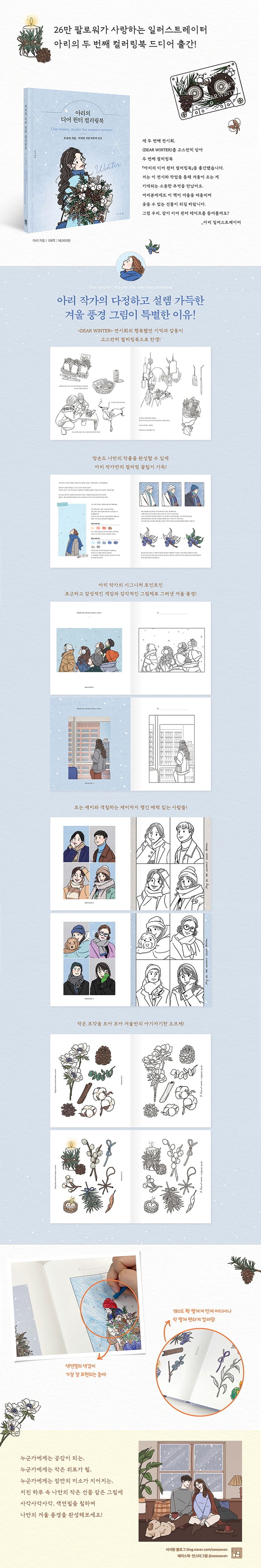 이 책 『아리의 디어 윈터 컬러링북』은 아리 작가의 두 번째 전시회였던 〈DEAR WINTER〉의 기록을 고스란히 담아낸 컬러링북이다. 아리 작가는 겨울을 날씨는 정말 춥지만 겨울을 즐기는 사람들의 각기 다른 모습도, 연말의 분위기와 흥겨운 캐럴에 즐거운 기분도, 곧 새로운 한 해를 맞이하리라는 설레는 마음도 느껴지는 사랑스러운 계절이라고 말한다. 그래서 겨울의 포근함과 두근거림을 꼭꼭 눌러 담아 그린 이 그림들에 독자들이 사부작사부작 색을 채워 넣는 시간이 힐링과 위안이 되기를 바라는 마음으로 한 장 한 장 그림을 그렸다.