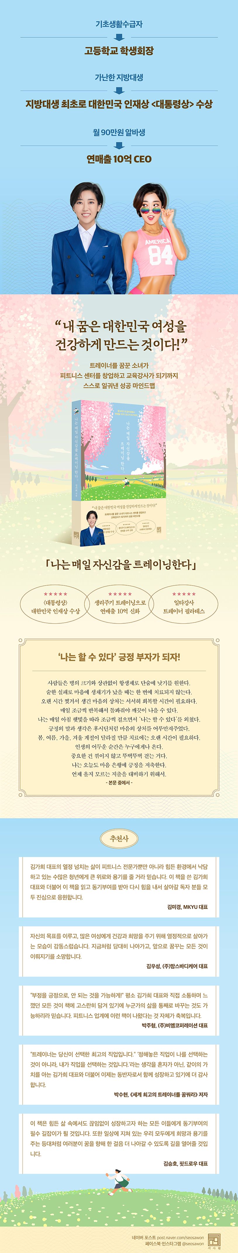 자신의 삶을 어떤 자세와 태도로 대하느냐에 따라서 인생의 모습은 확연하게 달라집니다. 김가희 대표의 이야기를 읽다 보면 어느새 두 주먹이 불끈 쥐어집니다. ‘나도 할 수 있다’ ‘나도 도전해보고 싶다’는 마음이 샘솟기 때문입니다.