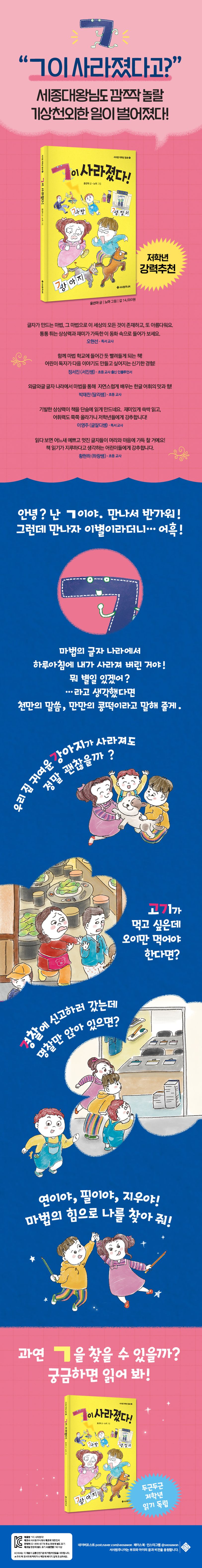 마법 학교 신입생인 쌍둥이 연이와 필이, 막내 지우가 펼치는 글자 마법의 세계에 어떤 일이 벌어진 걸까요? 우리의 소중한 첫 번째 자음 ㄱ을 찾아 주세요.