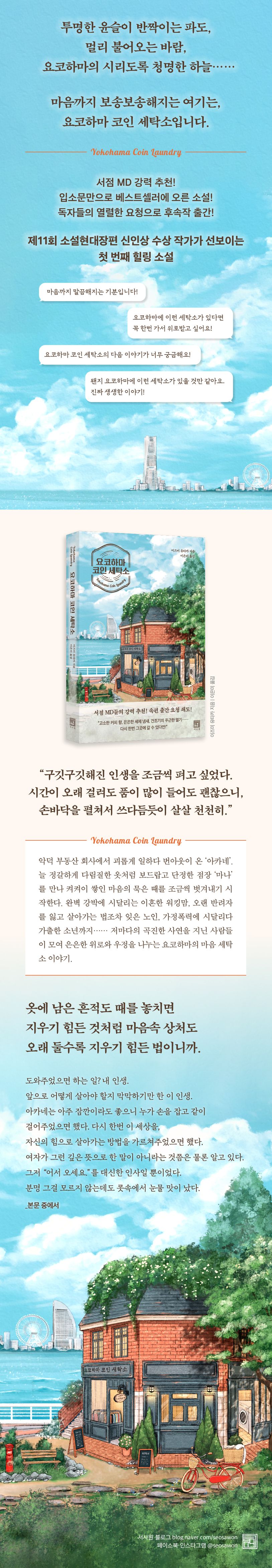 제11회 소설현대장편 신인상을 수상하며 혜성같이 등장한 작가, 이즈미 유타카. 유망한 신진 작가로 관심을 모은 그가 야심 차게 선보인 『요코하마 코인 세탁소』는 출간되자마자 서점 MD들의 주목을 받으며 입소문을 타고 순식간에 베스트셀러에 올랐다. 요코하마를 배경으로 한 이 소설은 독자에게 익숙한 ‘힐링 소설’의 문법에 따르면서도, 생생한 현장감과 전달력을 빛내며 독자들을 요코하마의 해변 도로에 데려다 놓는다. 소금기를 가득 머금은 바람 탓에 외부에 빨래 널기가 힘들어 세탁업이 발달했다는 항구 도시 요코하마. 이곳 세탁소를 찾는 사람들의 내밀한 일상에 다가갈수록 짠 내 가득한 요코하마의 바람처럼 인생의 또 다른 맛을 알게 될 것이다.