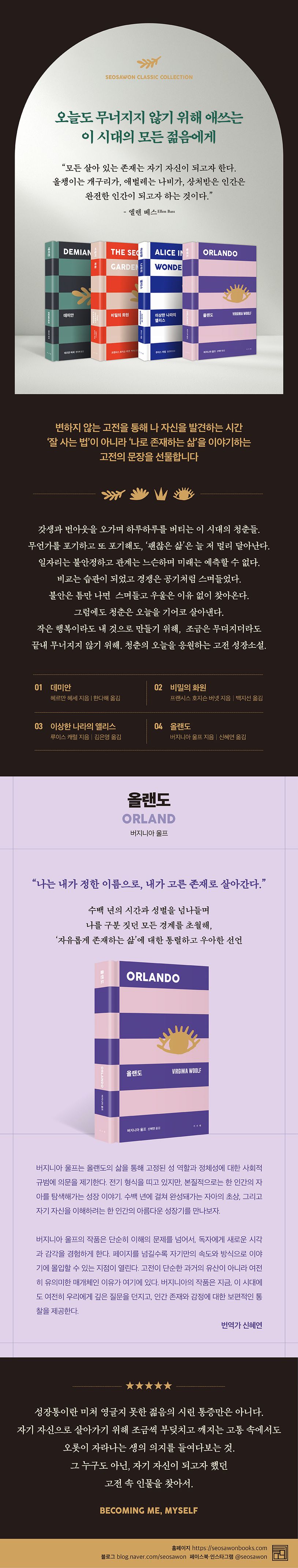 『올랜도』는 수백 년의 세월을 통과하며 자신의 정체성을 찾아가는 주인공 올랜도의 기나긴 여정을 그린 매우 독특한 소설이다. 16세기, 영국 귀족 청년이었던 올랜도는 어느 날 여성으로 변하게 되고, 이후 20세기까지 시대와 성별을 뛰어넘는다. 다양한 성별과 신분을 두른 채 여러 시대를 살아가는 올랜도는 시대적 규범이나 가치관이 결코 절대적이지 않으며 온전히 시대적, 사회적 산물임을 깨닫는다. 사회적 역할과 신분에 따라 개인에게 요구되는 기대 속에서 진정한 자아란 무엇인지 질문하고, 외적인 조건에 규정되지 않는 자아의 본질에 다가간다.
