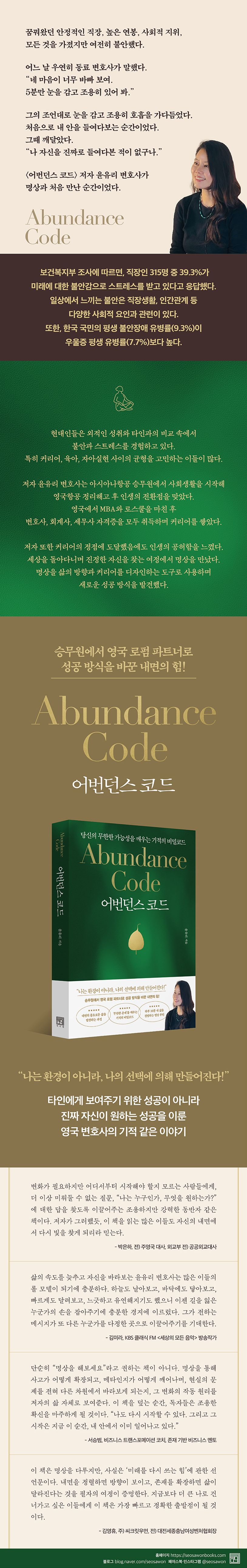 이 책은 20년 경력의 영국 변호사이자 대형 로펌(Brabners)의 지분(equity) 파트너인 윤유리 작가가 명상으로 되찾은 자신의 진짜 삶에 대한 이야기이다. 저자는 명상을 단순한 치유나 마음 챙김 수준을 넘어, 커리어와 삶의 방향을 디자인하는 강력한 자기 성장 시스템으로 제시한다. 아시아나항공, 영국항공 승무원으로 시작해 영국에서 변호사(Solicitor), 회계사(ACMA), 세무사(CTA) 자격을 모두 취득하고, 로펌 파트너 자리에 오른 독특한 커리어는 “한계를 넘는 방법은 노력이 아니라 존재 상태를 바꾸는 것”이라는 저자의 철학을 그대로 증명한다. 과연 저자는 어떻게 국제 조세·기업 구조·부동산·M&A라는 자본주의의 가장 복잡한 영역에서 자신의 커리어를 완성하고, 완전히 붕괴되었던 자신의 삶마저 건강하게 회복할 수 있었을까? ‘어번던스 코드’는 저자가 만든 실전 명상 시스템이다. 자신의 삶이 너무 힘겹다고 생각하는 모든 이들에게 잠재된 가능성을 스스로 깨닫고 삶을 풍요롭고 자유롭게 만들 수 있는 비결을 제시한다.