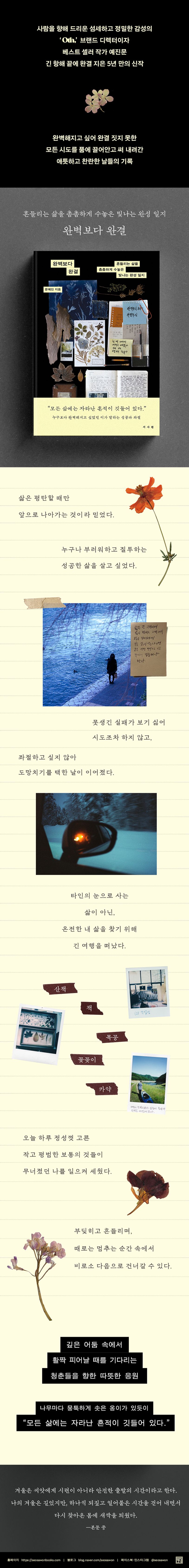 어떤책은마지막책장을넘긴후에도쉽사리손에서내려놓지못하기도한다.《완벽보다완결》은한권의책이라기보다누군가가정성들여꾸미고쓴일기장을들여다보는것같다.주홍빛윤슬과짙은초록의풍경,하얀설산의핀란드사진,색색의압화,직접손으로쓴메모는활자와는다른감흥을준다.속깊은문장들은담담하게읽는이의시선을빼앗는다.이쯤되면작품을보는것같다.