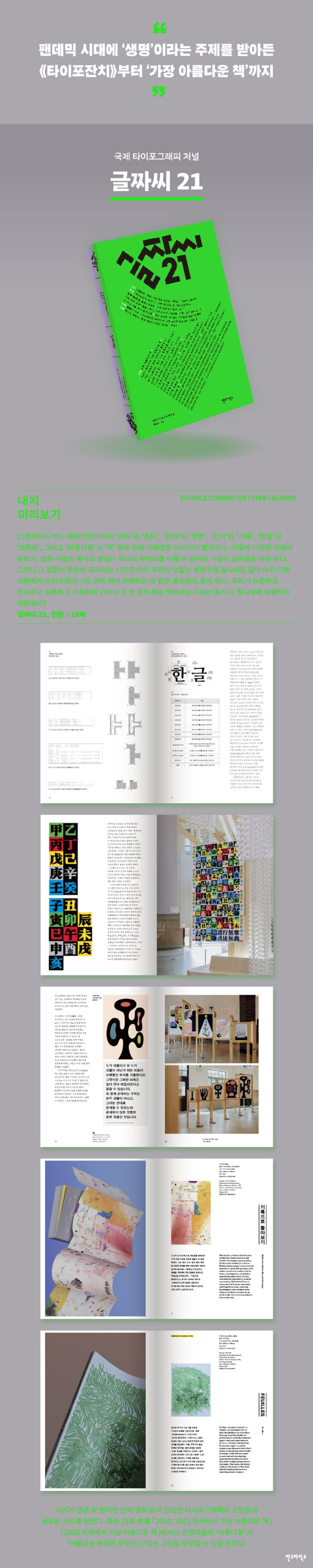 『글짜씨21』은 팬데믹 시대에 ‘생명’이라는 주제를 받고 ‘거북이와 두루미’라는 다소 엉뚱한 전시 제목으로 열게 된 《타이포잔치 2021》의 기획 과정과 후기, 글리프 획 값을 조정해 글자를 생성하는 한글 가변 폰트 시스템 스템폰트, 한류의 영향으로 관심이 높아진 한글 워크숍 후기 등, 세계가 멈춘 듯 했지만 전혀 멈춰 있지 않았던 타이포그래피의 고민들과 새로운 시도를 짚었다. 특히 21호 부록 「2020, 2021 한국에서 가장 아름다운 책」 「2020 세계에서 가장 아름다운 책」에서는 선정작들의 ‘아름다움’과 ‘아름다운 책이란 무엇인가’라는 고민을 마주할 수 있을 것이다.