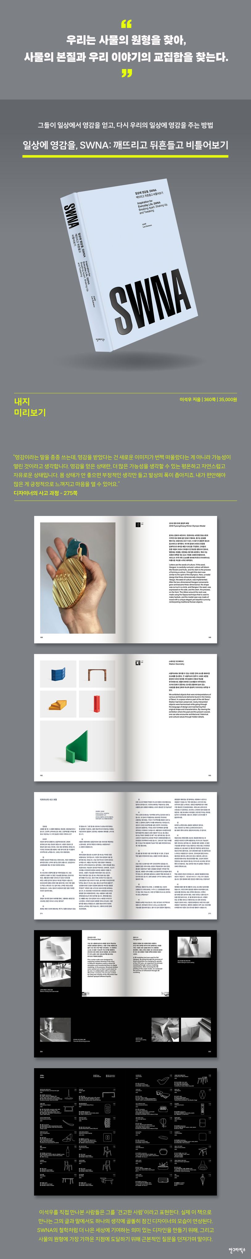 영감은 어디서 올까? 디자인 오피스 SWNA의 대표 이석우의 답은 단순하고도 명쾌하다. “보고 또 보라.” 아직 SWNA를 모른다면, 2018년 평창 동계 올림픽 메달 디자이너를 찾아보자. 어쩌면 지금 우리 옆에 있을지도 모르는, 그만큼 일상 곳곳에 자연스럽게 자리해 알아채지 못했던 제품 또한 SWNA의 디자인이다. 이 책 『일상에 영감을, SWNA』는 18년간의 수많은 프로젝트 중 이석우가 선별한 62개 프로젝트와 그 프로세스를 기록한, 작품집의 형식을 한 책이다.
