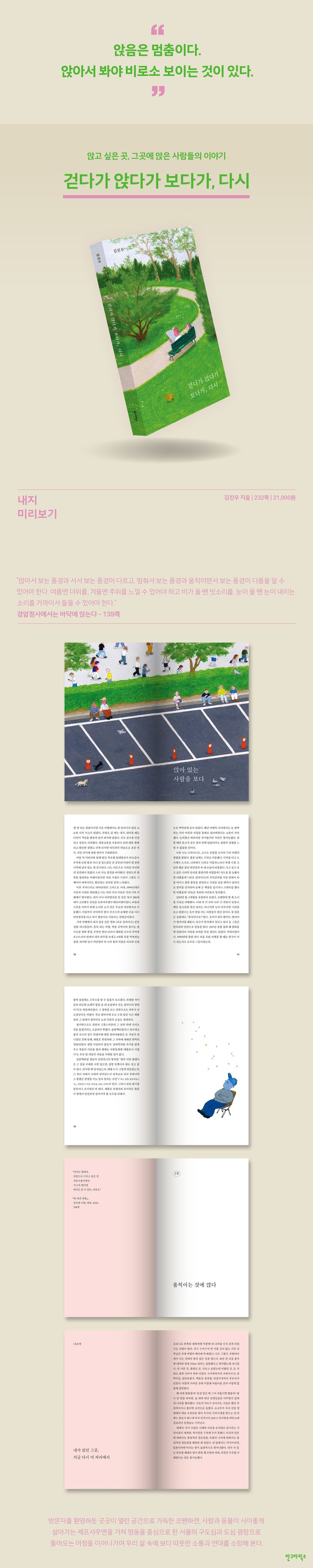 앉아서 바라보아야 들리는 이야기가 있다. 앉은 이의 모습부터 앉은 시선에 들어온 일상과 공간, 도시의 모습까지, 그곳에 앉아 무심코 지나치고 미처 알아보지 못한 이야기에 귀를 기울인다. 전작 『앉지 마세요 앉으세요』에서 각양각색의 의자를 소개한 저자 김진우는 이번 신작 『걷다가 앉다가 보다가, 다시』에서 의자라는 사물에서 나아가 그곳에 앉은 사람들과 그를 둘러싼 세상을 관찰한다. 그렇게 써 내려간 글에는 디자이너로서 사회 이슈를 바라보는 저자의 시선이 한층 더 짙게 담겼다. 때로는 따뜻하고 때로는 칼칼하게. 그 시선은 보다 더 많은, 보다 더 다양한 사용자를 배려하는 유니버설 디자인에 가닿고, 도움이 필요한 현장과 관심은 필요한 약자에게 손을 내민다.