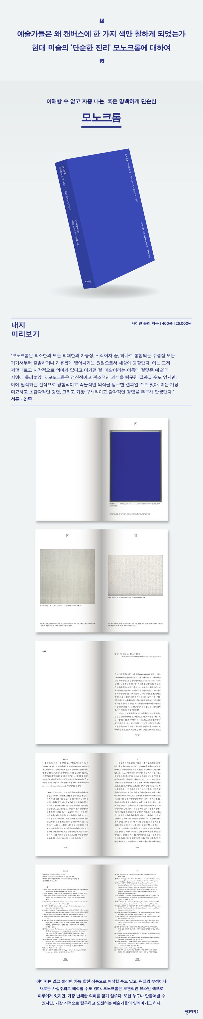 등장하는 작품은 모노크롬과 ‘이상적인 모노크롬에서 벗어난 연속체’인 모노크로매틱과 덜 본질적인 모노크롬의 예도 포함하며, 회화뿐 아니라 조각, 설치 작품, 영화, 사진, 레디메이드까지 확장된다. 저자는 모노크롬의 ‘세계적’ 역사를 담고자 했으나 서양에 치우친 점을 인정하면서도, 남미와 동아시아의 모노크롬에 관한 논의로 이런 편향을 상쇄하고자 노력했다. 특기할 만한 건 한국의 모노크롬 회화 작품인 ‘단색화’에 온전히 한 장을 할애했다는 점이다. “내가 서양의 회화 장르라고 여겼던 모노크롬이 사실 전 세계적인 현상이거나, 적어도 머나먼 한국까지 확대된 현상이라는 사실을 깨닫게 해주었다.” 이 또한 저자가 한국에 살기 때문이라는 점을 밝혀둔다.