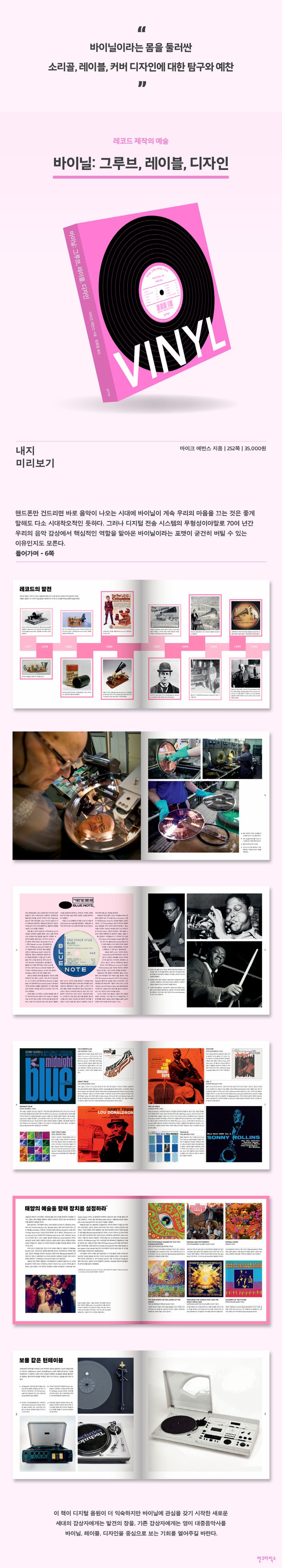 비닐(Vinyl)이라고 쓰고 ‘바이닐’이라고 읽는 소위 LP 레코드의 음악사를 레코드 판, 레이블, 디자인을 통해 본다. 검은색 폴리염화비닐 알갱이가 녹아 바이닐 비스킷이 되고, 소리가 새겨져 마침내 프레스되는 과정과 LP 중앙을 장식하는 라벨이자 때로는 장르 그 자체를 대변하는 다양한 레이블의 이야기, 시대에 남은 앨범의 커버, 패키지 디자인과 턴테이블, 음악이 끝난 후 재생되는 숨겨진 런아웃 그루브 메시지 등, 디지털 음원이 지배하는 시대에도 살아남아 새로운 호황을 누리는 바이닐을 ‘감싼’ 것들에 대한 음악사다.