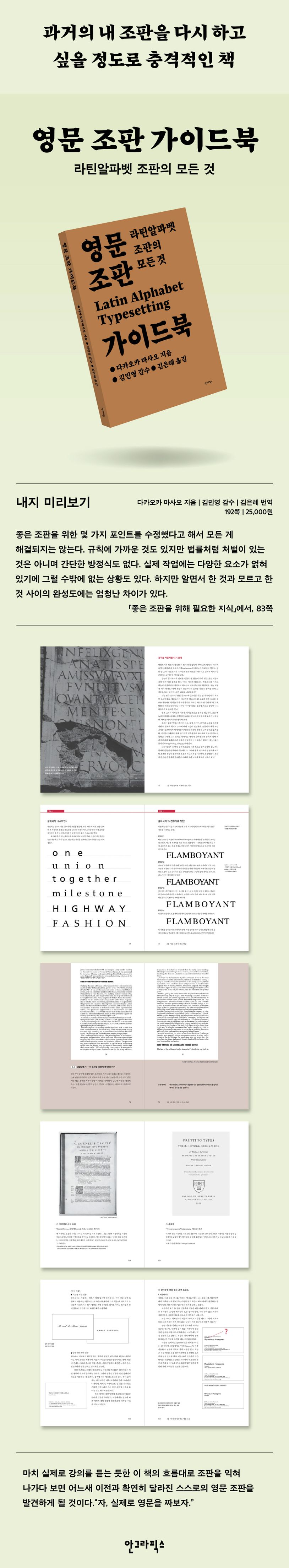 『영문 조판 가이드북』에는 그 부제처럼 ‘라틴알파벳 조판의 모든 것’이 있다. 저자 다카오카 마사오는 아버지이자 스승인 다카오카 주조를 이어 라틴알파벳 금속활자를 사용하는 활판인쇄소 ‘가즈이공방’을 운영하며, 역시 아버지에게 전수받은 조판 및 타이포그래피 지식을 모두 여기에 담았다.