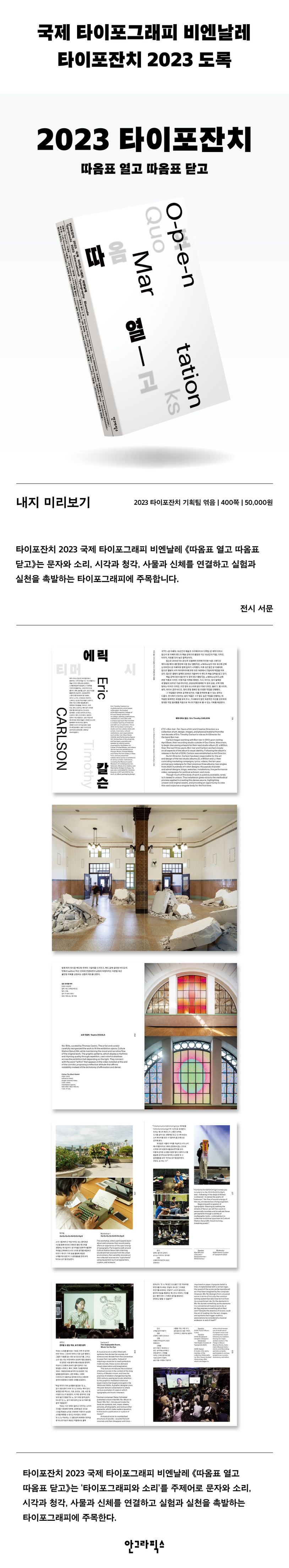 2023년 9월 19일(화)부터 10월 14일(일)까지 문화역서울284에서 열린 타이포잔치 2023 국제 타이포그래피 비엔날레 《따옴표 열고 따옴표 닫고》는 ‘타이포그래피와 소리’를 주제어로 문자와 소리, 시각과 청각, 사물과 신체를 연결하고 실험과 실천을 촉발하는 타이포그래피에 주목했다. 본 도록은 전시에 참여한 16개국 39명/팀의 작가와 작품에 관한 상세한 해제와 풍부한 도판으로 작품들을 생생하게 감상할 수 있도록 돕는다.