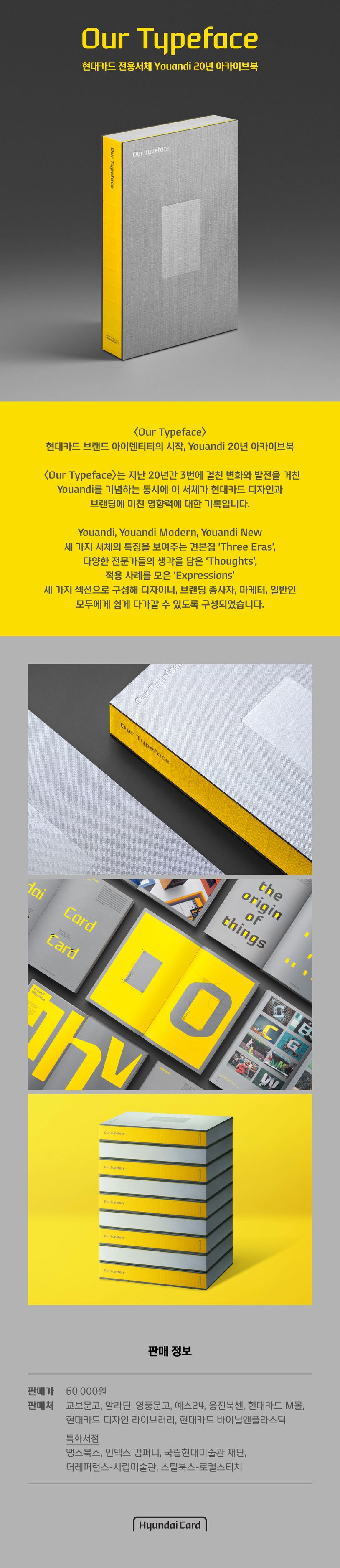 『Our Typeface』는 현대카드 디자인의 근간이자 브랜드 앰배서더라는 임무를 바탕으로 서체 프로젝트의 여정을 기록한 아카이브북이다. 책은 지난 20년간 세 번에 걸친 변화와 발전을 거친 Youandi를 기념하는 동시에 이 서체가 현대카드 디자인과 브랜딩에 미친 영향력에 대해 기록한다. 'Youandi', 'Youandi Modern', 'Youandi New' 세 가지 서체의 특징을 보여주는 견본집 「Three Eras」 섹션, 다양한 전문가들의 생각을 담은 「Thoughts」 섹션, 적용 사례를 모은 「Expressions」 섹션, 총 세 가지 섹션으로 구성해 디자이너, 브랜딩 종사자, 마케터, 일반인 모두 필요에 따라 접근할 수 있게 했다. 북 디자인 역시 Youandi 서체의 모티브이자 현대카드 디자인의 시작점인 카드 플레이트 비율 1:1.58 판형과 그리드를 적용했다. 또한 책 출간과 맞물려 8월 20일부터 10월 13일까지 현대카드 디자인 라이브러리에서 연계 전시를 진행한다.