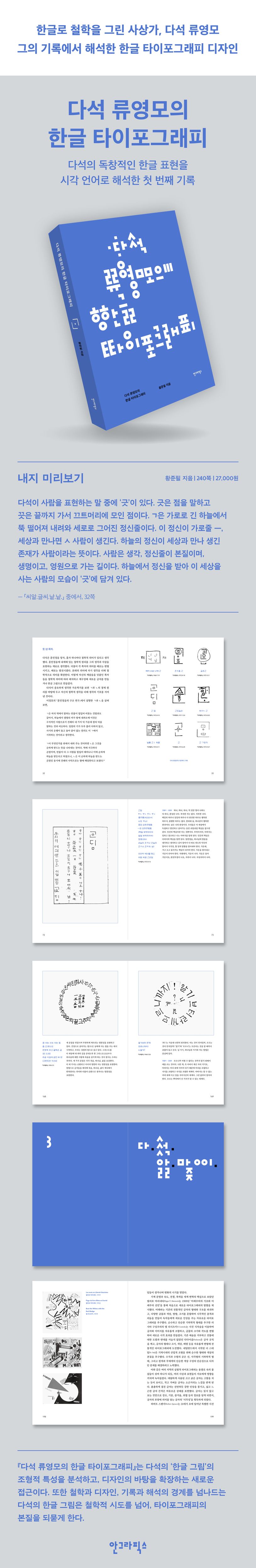 다석 류영모(1890–1981)는 우리나라의 큰 사상가이자 철학자, 종교인으로 기독교·불교·유교 등 동서양의 종교와 철학에 두루 밝아, 이를 융합하여 독창적인 사유 체계를 구축했다. 우리말과 글로 철학을 한 최초의 사상가로 알려져 있으며, 그의 사유와 일상 속 깨달음을 일기 형식으로 기록한 『다석일지』를 남겼다. 이 책 『다석 류영모의 한글 타이포그래피』는 한글을 재료 삼아 세상을 설명하려 한 다석의 글자가 품은 뜻 알갱이, 글꼴 얼개, 글꼴 그림을 타이포그래피로 해석하려는 첫 번째 기록이다. 이 책을 통해 표현의 영역은 더 넓어지고, 한글 타이포그래피는 철학의 언어가 된다.