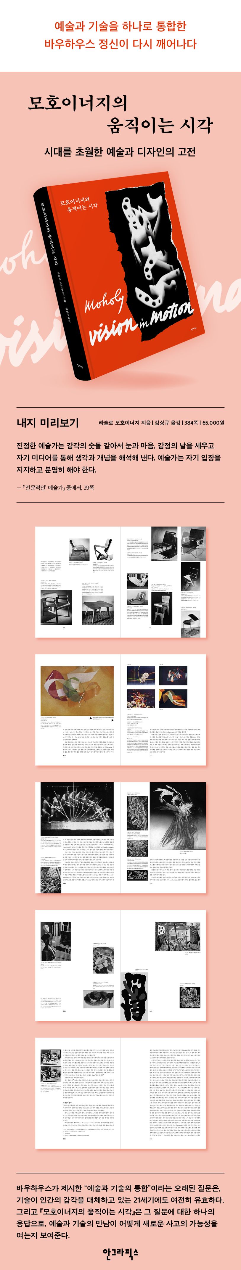 한국어판은 원서의 정교한 편집 디자인을 충실히 복원하고, 2005년 예술의전당 전시 〈모호이너지의 새로운 시각〉을 기획한 김상규 한국과학기술대학교 교수가 번역했다. 바우하우스가 제시한 “예술과 기술의 통합”이라는 오래된 질문은, 기술이 인간의 감각을 대체하고 있는 21세기에도 여전히 유효하다. 그리고 『모호이너지의 움직이는 시각』은 그 질문에 대한 하나의 응답으로, 예술과 기술의 만남이 어떻게 새로운 사고의 가능성을 여는지 보여준다.