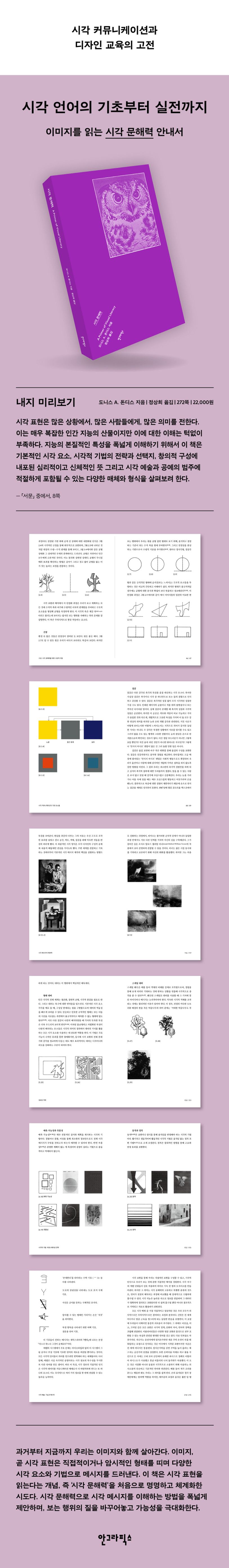 시각 커뮤니케이션과 디자인 교육의 고전 『시각 문해력』. 이 책은 이미지를 읽는다는 개념, ‘시각 문해력’을 처음으로 명명하고 체계화한 시도다. 저자 도니스 A. 돈디스는 디자이너이자 교육자로 시각 메시지를 해부하면서 기본적인 시각 요소, 시각 구문, 시각 기법을 분석하고 여러 시각 예술 매체에 적용해 시각 문해력을 폭넓게 소개한다. 각 장의 끝에는 연습 문제가 수록되어 시각 문해력을 한층 깊이 탐구할 수 있다. 독자는 시각 문해력을 이론과 실전으로 두루 살펴보면서 시각 언어와 시각 커뮤니케이션을 활용하는 수용자와 제작자로 첫걸음을 내디딜 수 있을 것이다.