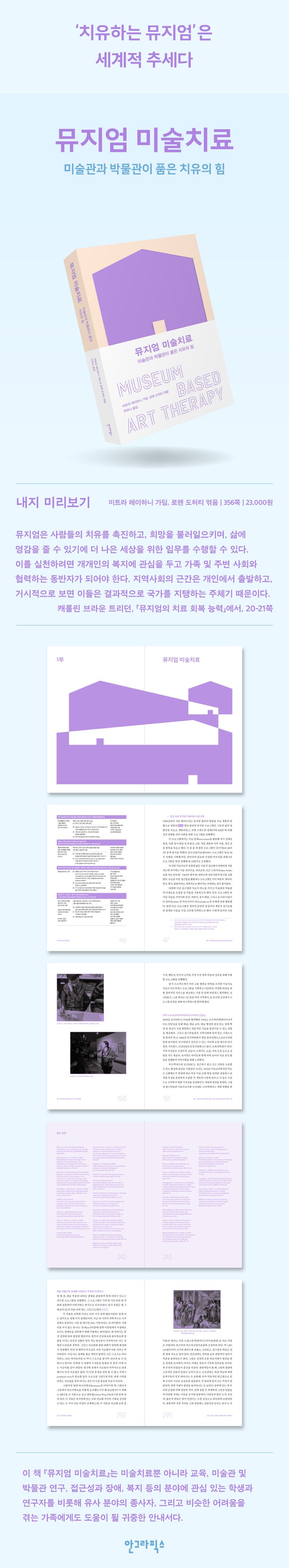 ‘예술적치유(ArtfulHealing)’프로그램의코디네이터로서예술감상과작품제작활동이사람들의치유와건강에긍정적영향을미치는것을바로곁에서지켜보았다.미술관만이할수있는독특한방식으로사람들이혜택을누릴수있는가능성이확인되었다.그동안예술보건분야전문가들이목격해온사실은점차연구를통해서밝혀졌다.궁극적으로예술은힘든시기에사람들의치유를돕고,우리를서로단단히연결시켜줄수있다는것을의미한다.