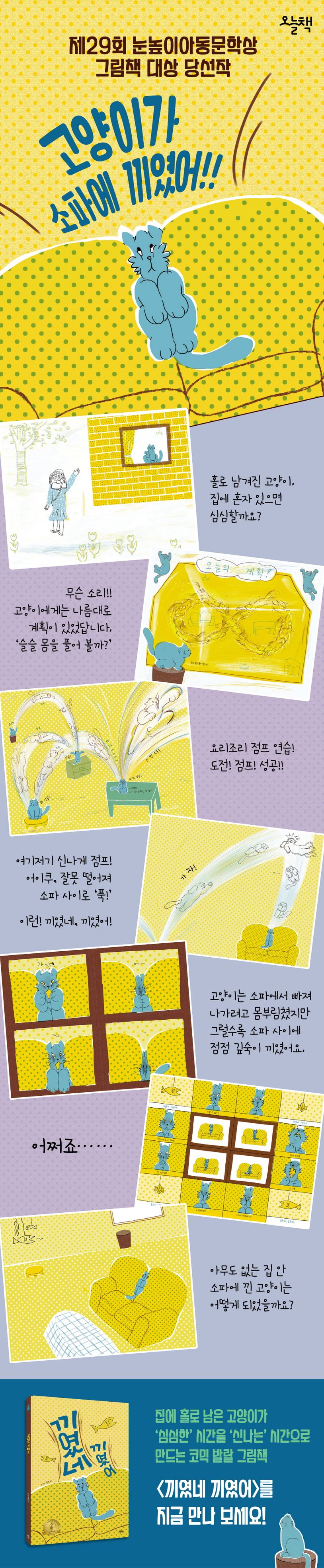 대교문화재단 눈높이아동문학대전은 아동문학의 새로운 기틀을 다지고, 역량 있는 아동문학가 발굴을 위해 1993년 시작되었습니다. 매년 수상작을 배출하여 올해로 30년을 맞이하였습니다. 제29회 눈높이아동문학상 그림책 대상 수상작 《끼였네 끼였어》는 '반복되는 일상에 활기를 불어넣는 색다른 시선'으로 독자에게 신선한 시각을 전하는 코믹 발랄한 작품입니다.