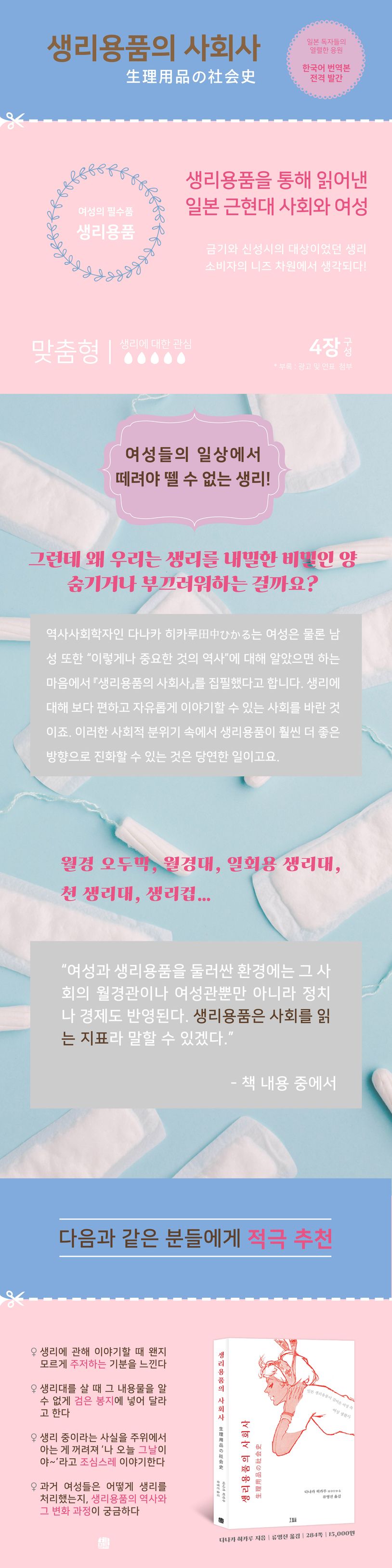 여성은 물론 남성 또한 “이렇게나 중요한 것의 역사”에 대해 알게 된다면 생리용품 또한 더 좋은 방향으로 진화할 것이고, 생리용품의 질적 향상으로 여성들의 일상생활 역시 보다 자유로워질 수 있을 것입니다. 일본 생리용품의 역사를 다루고 있는 책이지만 한국 생리용품 역시 미국과 일본의 영향을 크게 받았다는 점에서, 우리에게도 많은 영감과 질문거리를 던져 주는 책이라 생각합니다.
