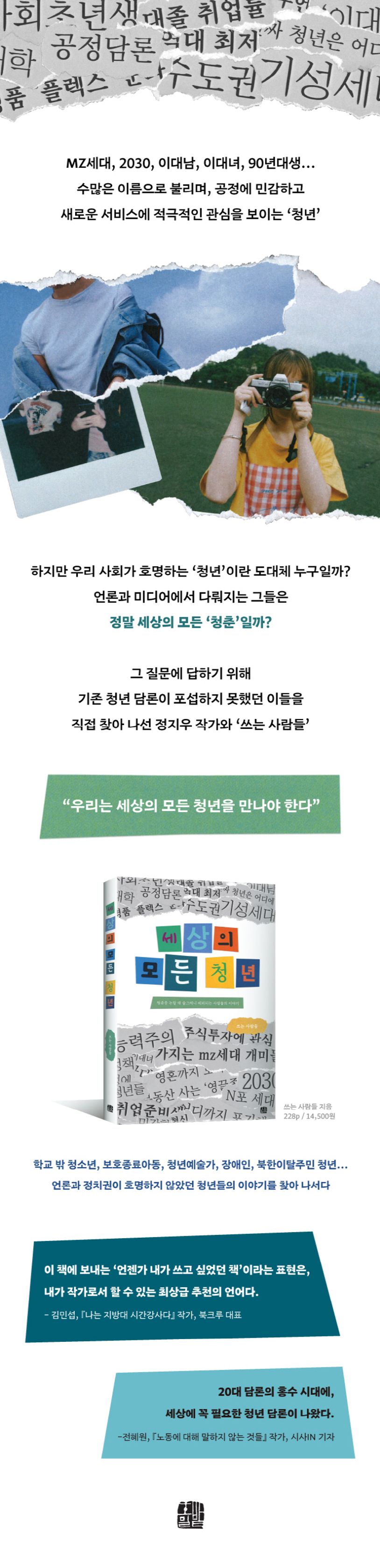 그렇다면 드넓은 캠퍼스를 누비는 대학생, 열정과 패기로 똘똘 뭉친 신입사원이라는 한정된 이미지 밖 '청년'들의 목소리는 어디에 있을까? 그들의 삶은 과연 정치권과 미디어가 대변하는 '청년의 삶'에 포함되어 있을까? 청년을 세대와 사회적 관점으로 해석하고 분석하는 거대 담론은 늘어가지만, 그 사이에서 청년 개개인의 목소리는 오히려 작아져만 간다.