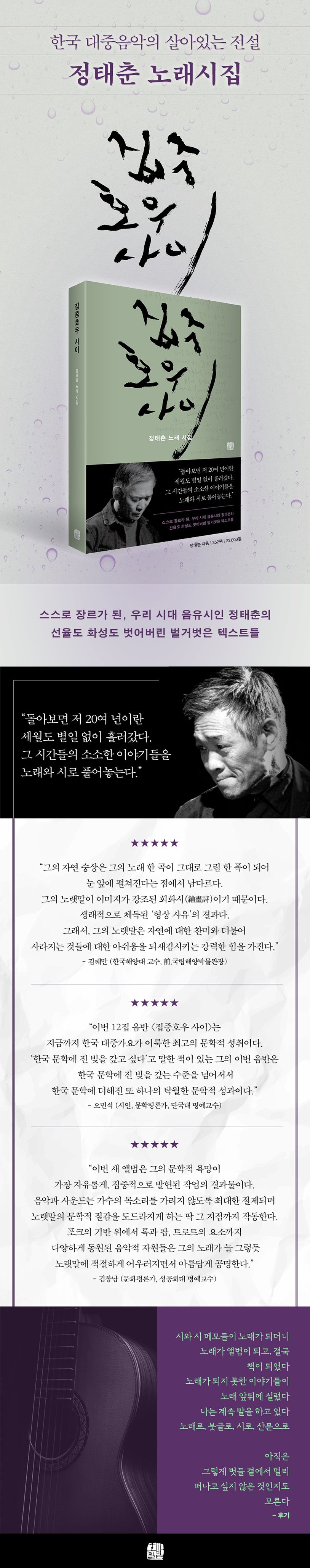 책에는그가직접찍은사진들이캡션없이삽입되어붓글씨와함께무심한듯진솔한시적정조를더한다.덧붙여,그의시편곳곳에는동양의풍자시정신,불교의무상관,동아시아예술가들의사유전통이깊게배어있어독자들에게시적아름다움과철학적성찰을동시에선사한다.자서(自序)를통해,“돌아보면저20여년이란세월도별일없이흘러갔다.그시간들의소소한이야기들을노래와시로풀어놓는다.”라고말한정태춘의이번노래시집『집중호우사이』는동명의정규12집음반과함께음악과문학의경계를허무는새로운시도이자사유와예술,삶의통합을지향하는그의예술철학을보여주는또하나의문학적성취이다.