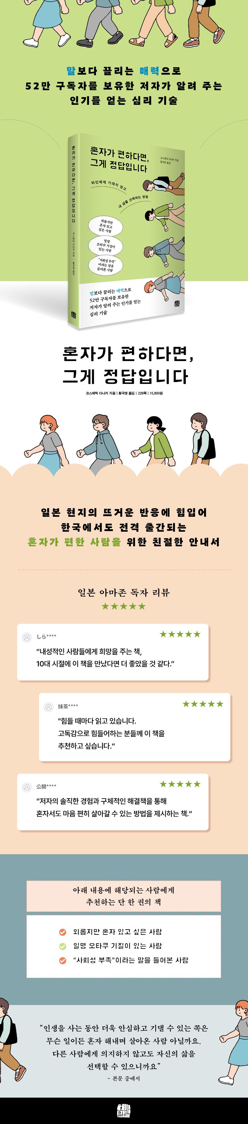 출간 이후 독자들의 꾸준한 관심을 받아온 『고독 마인드 입문』이 개정판으로 다시 돌아온다. 이번 개정판은 원작 『모이지 않고 편히 사는 올바른 고독 마인드』의 메시지를 더욱 쉽고 친근하게 전달할 수 있도록 재해석하여 『혼자가 편하다면, 그게 정답입니다』라는 새로운 제목으로 선보인다. 표지 역시 혼자여도 씩씩하게 자신의 길을 걸어가는 일러스트로 재구성해 독자들이 고독의 의미를 긍정적으로 받아들일 수 있도록 했다.