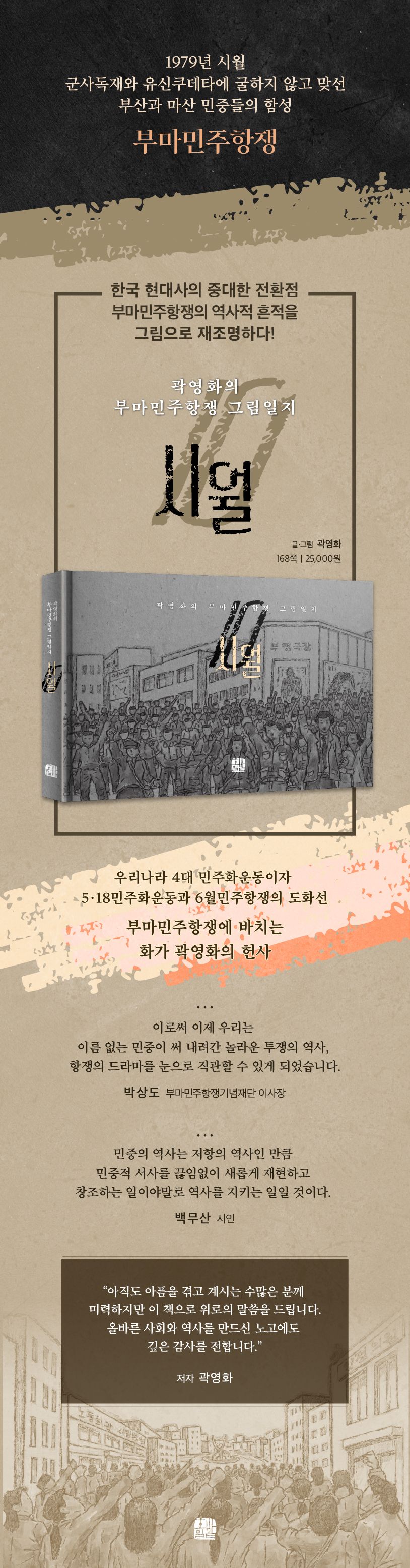 재현을 넘어 곽영화 화백의 붓끝은 민주항쟁의 시간을 오늘로 불러낸다. 그림일지라는 형식을 통해 독자는 역사의 현장을 함께 걷듯 한 장 한 장 넘기며 민주주의가 피어오른 순간을 체험하게 된다. 그리하여 우리는 과거의 항쟁을 복기하는 동시에 지금의 민주주의는 과연 참된지 자문할 수 있을 것이다.