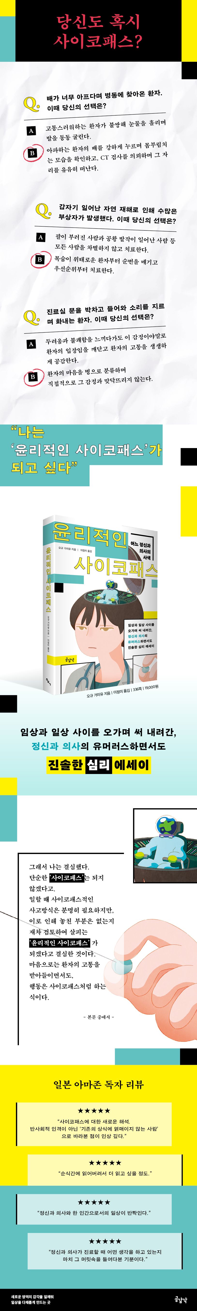 정신과 의사는 환자의 고통을 모두 짊어질 수도, 완벽히 외면할 수도 없다. 그래서 저자는 “차라리 윤리적인 사이코패스가 되고 싶다”고 고백한다. 모든 환자의 상처를 끌어안아 무너지는 대신, 불가피하게 누군가의 고통을 우선순위에서 뒤로 미루더라도 ‘다시 돌아와 성찰할 수 있는 태도’를 지키겠다는 다짐이다.