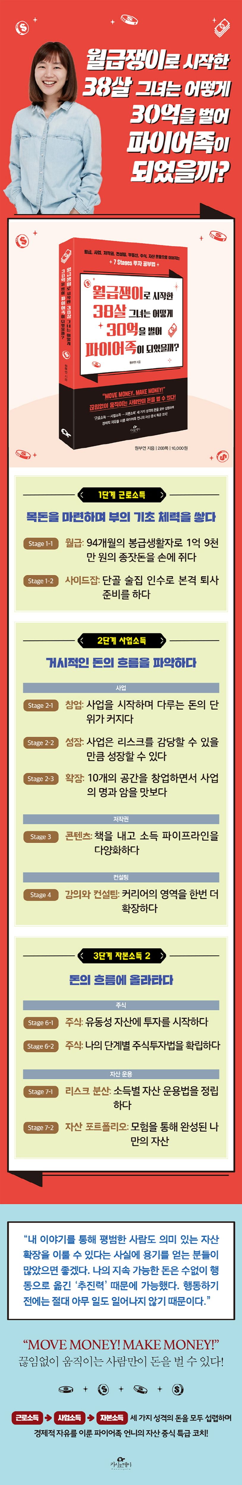 저자는 자산 증식 과정에서 갖은 시행착오를 겪지만 굴하지 않고 늘 지난 시절의 착오를 발판 삼아 새로운 소득의 단계로 멈추지 않고 나아간다. 이렇게 다양한 형태의 소득을 경험하며 저자가 돈의 속성에 대해 새롭게 깨닫고 의미 있는 자산의 성장을 일궈가는 모습은 창업이나 투자 등을 머뭇거리는 독자들에게 ‘끊임없이 움직이는 사람만이 돈을 벌 수 있다’는 사실을 환기하고, 자산 증식을 위한 건강한 동기부여를 해줄 것이다.
