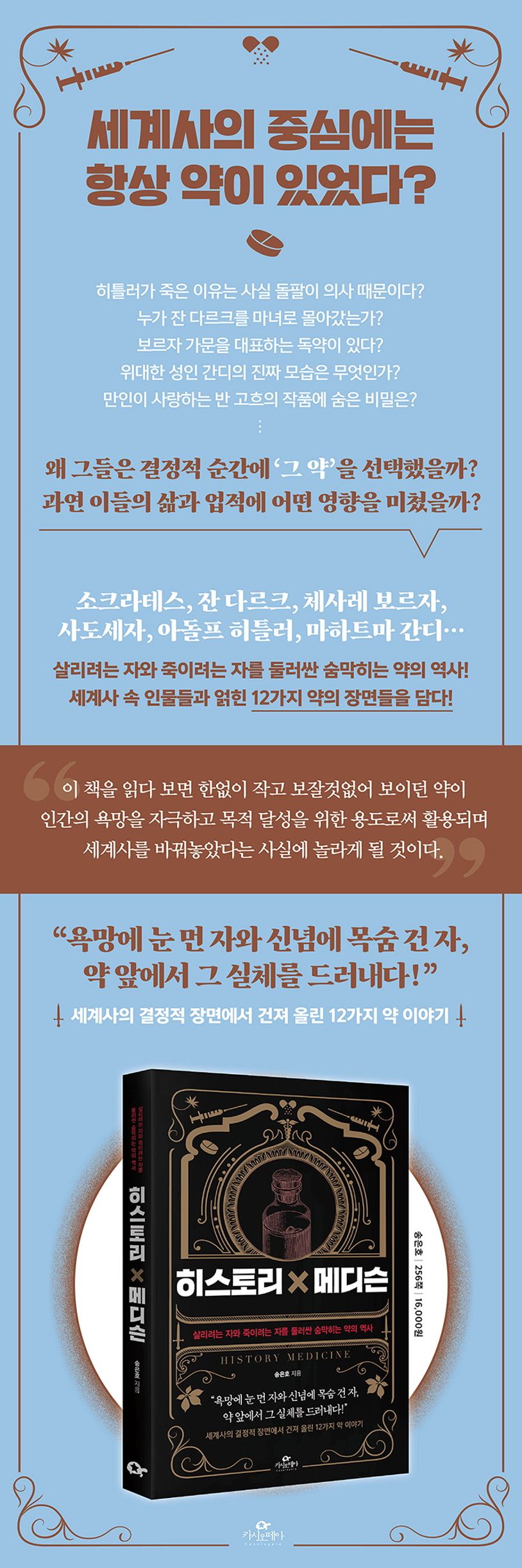 히틀러가 죽은 이유는 사실 돌팔이 의사 때문이다? 누가 잔 다르크를 마녀로 몰아갔는가? 보르자 가문을 대표하는 독약이 있다? 위대한 성인 간디의 진짜 모습은 무엇인가? 만인이 사랑하는 반 고흐의 작품에 숨은 비밀은? 그동안 우리가 주목하지 않았던 ‘약’을 통해 세계사를 파헤치는 책《히스토리×메디슨》이 카시오페아에서 출간됐다. ‘인문학 하는 약사’로 알려진 송은호 저자는 이 책에서 ‘약사’라는 전문성에 인문학적 지식을 더하는 자신만의 스토리텔링을 합쳐 살리려는 자와 죽이려는 자를 둘러싼 숨막히는 역사를 흥미진진하게 들려준다.