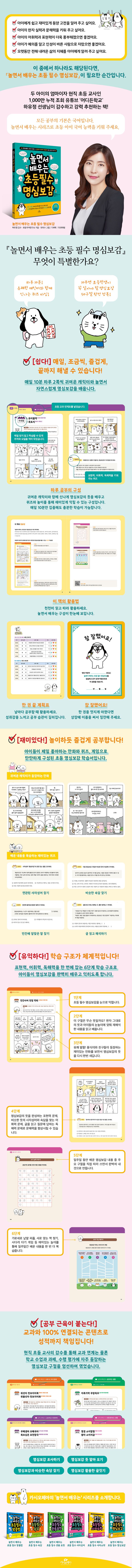 내 아이가 바른 인성을 가진 지혜로운 아이로 자라길 바라는 부모님들의 마음은 모두 같지만, 어려운 한자어로 이루어진 명심보감을 재미있게 읽히기란 쉽지 않습니다. 그래서 카시오페아 ‘놀면서 배우는’ 시리즈의 여섯 번째 책인 『놀면서 배우는 초등 필수 명심보감』에는 초등 교과와 연계된 명심보감의 뜻을 공부하는 내용을 담았습니다. 이 책을 통해 아이들은 초등학생이 꼭 알아야 할 명심보감 50구절을 배울 수 있습니다. 귀엽고 엉뚱한 캐릭터들의 대화를 통해 명심보감의 쓰임을 알고, 퀴즈를 풀면서 비슷한 속담 및 사자성어를 학습하며, 질문에 답하는 문제로 배운 명심보감을 복습하다 보면 공부의 기초가 되는 표현력, 어휘력, 독해력, 즉 ‘국어 3력’을 모두 잡을 수 있을 것입니다. 여기에 더해 현직 초등 교사이자 누적 조회수 1,000만의 인기 유튜브 ‘어디든학교’ 운영자이기도 한 하유정 선생님이 책 내용을 직접 꼼꼼하게 감수하여 콘텐츠의 신뢰도를 높였습니다.