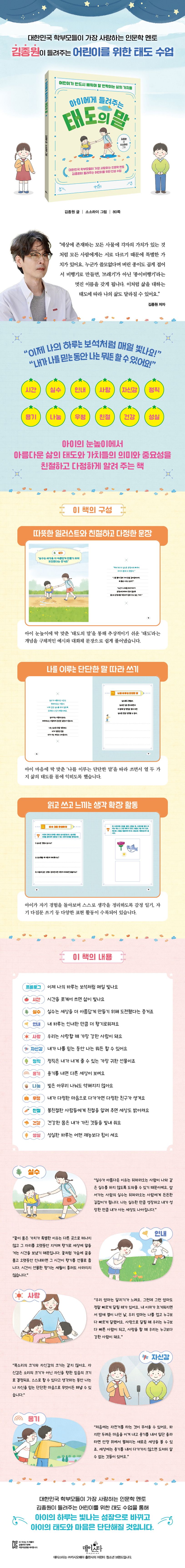 인문학과 자녀교육을 주제로 20여 년 동안 책을 써 온 김종원 작가는 그동안 아이들에게 어떻게 말해야 아이 내면을 단단하게 키울 수 있을지 강연하고 책을 쓰며 수많은 학부모 독자들의 마음을 울렸습니다. 이번에는 어린이들이 일상에서 아름다운 삶의 가치와 태도를 경험하며 반짝이는 하루를 살아가길 바라는 마음으로 《아이에게 들려주는 태도의 말》을 선보입니다. 《아이에게 들려주는 태도의 말》은 김종원 작가 특유의 따뜻하고 섬세한 시선으로 그려 낸 어린이 자기계발서로, 아이의 눈높이에서 ‘시간’, ‘실수’, ‘인내’, ‘사랑’, ‘자신감’, ‘정직’, ‘용기’, ‘나눔’, ‘우정’, ‘친절’, ‘건강’, ‘성실’ 등 열두 가지 아름다운 삶의 태도와 가치들의 의미와 중요성을 친절하고 다정하게 알려 주는 책입니다. 대한민국 학부모들이 가장 사랑하는 인문학 멘토 김종원이 들려주는 어린이를 위한 태도 수업을 통해 아이의 하루는 빛나는 성장으로 바뀌고 아이의 태도와 마음은 단단해질 것입니다.