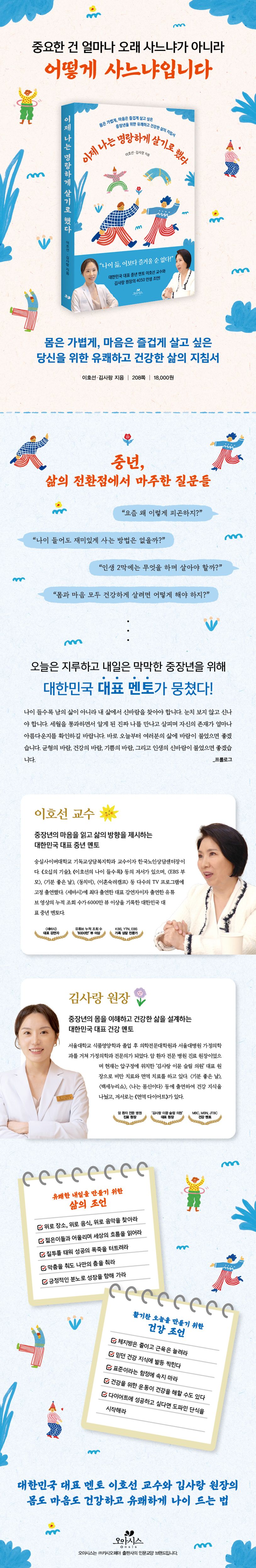건강은 행복한 삶을 살아가는 데에 있어 기본 조건이다. 그리고 백세 시대가 다가옴에 따라 중장년의 ‘건강한 삶’에 대한 관심과 소비가 늘고 있다. 이때 ‘건강한 삶’이란 단순히 질병이 없는 상태가 아닌 신체적·정신적으로 조화로운 상태를 유지하며 유쾌하고, 재미있는 삶을 살고자 함을 의미한다. 두 저자는 몸은 건강하게 마음은 유쾌하게 살아가는 삶의 중요성을 깨닫고, 중장년에게 꼭 필요한 인생 조언을 전하기 위해 이 책을 집필했다. 한국노인상담센터장으로 일하며 노년에 대해 고민해 왔고, 중장년을 위한 강연과 유튜브 채널 〈이호선의 나이 들수록〉을 운영하면서 중장년과 꾸준히 소통해 온 이호선 교수는 경험과 삶의 노하우를 바탕으로 긍정적인 분노, 자존감, 도파민 단식 등 지금보다 더 유쾌하고 즐거운 마음을 위한 조언을 전한다. 김사랑 원장은 서울대병원 가정의학과에서 수련받았고, 가정의학과 전문의로 암 환자 전문병원에서 근무했으며, 다수의 TV 프로그램에 출연하며 건강 정보를 전했던 경험을 바탕으로 건강한 나이 듦을 위한 건강 정보와 실천법을 담았다. 이 한 권의 책을 통해 독자는 몸과 마음의 건강을 조화롭게 챙기면서 유쾌하게 나이 드는 방법을 알아 갈 수 있다.