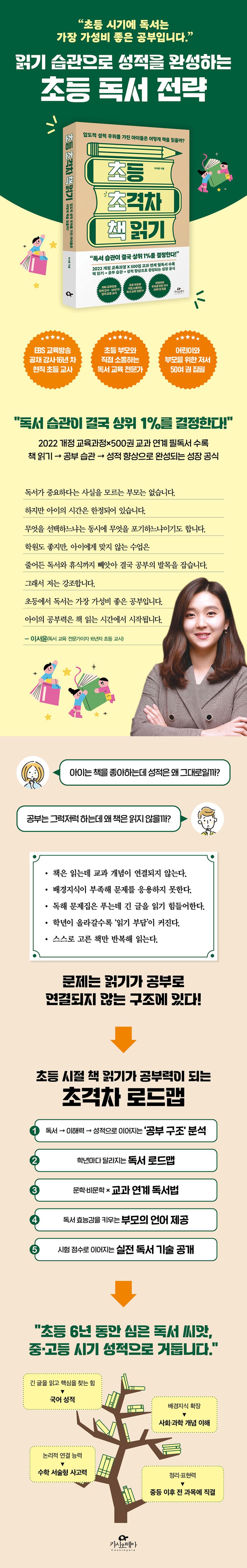 "초등6년동안심은독서씨앗중고등시기성적으로거둡니다."읽는양이아닌‘읽는방식’이성적을만든다독서는긴호흡으로생각을확장하는발산의작업이고,교과학습은그확장된사고를구조화하는수렴의과정이다.이두가지가연결될때아이는읽고이해하고정리하는힘을얻게된다.이책은우리가흔히놓치는독서의단계적성장,초등6년을관통하는읽기발달곡선,독서효능감을만드는부모의언어,독서와성적의상관관계를보여주는실제교실사례를통해‘책읽기→이해력→성적’의흐름을구체적으로제시한다.이런원리를이해하면왜어떤아이들은같은시간을공부해도훨씬빠르게성장하고,어떤아이들은제자리에서헤매는지가선명하게드러난다.결국핵심은‘문제집을얼마나문제를풀었냐’가아니라,아이의‘독서가얼마나자연스럽게공부로이어지도록설계되어있는가’에있다.이책은바로그연결고리를명확한전략으로제시한다.학년별맞춤전략과과목별실전팁그렇다면이런독서력이실제로어떻게길러질까?이책은단순히책목록을나열하는것이아니라학년별로언제,어떤난이도의책을어떻게읽어야하는지상세히제시한다.특히읽기독립을위한기초독서를다지는1·2학년,교과개념을확장하는독서를하는3·4학년,중등학습으로점프하는비판적독서를하는5·6학년까지학년별교과연계독서로드맵은부모들이가장어려워하는지점을정확히해결해준다.또한문학·비문학의다른독서방식,교과서개념확장법,교과연계책고르는기준,교과·학습만화사용법,아이생각을열어주는질문31개등시험에서실제성적으로이어지는독서기술을풍부하게담았다.초등독서가중·고등성적을결정짓는이유중학교이후의공부는‘읽기→이해→정리’의반복이다.초등시절독서가단단한아이들은길고복잡한지문도빠르게이해하고,핵심을정리하며,여러자료를통합해사고하는힘이이미길러져있다.반면독서경험이부족한아이들은문제풀이보다글을읽는데시간을더쓰게되고,그차이가곧성적과자신감의격차가된다.결국초등6년동안쌓이는독서력은중·고등내신,수능,사고력평가전반의성패를가르는가장큰변인이다.이책은그변인을부모와교사가함께설계할수있는지식·방법·전략으로정리한첫실전안내서다.초등6년의시간을어떻게채우느냐가아이의중·고등성장을결정짓는만큼이책은부모가지금바로실천할수있는가장현실적이고효과적인길잡이가되어줄것이다.