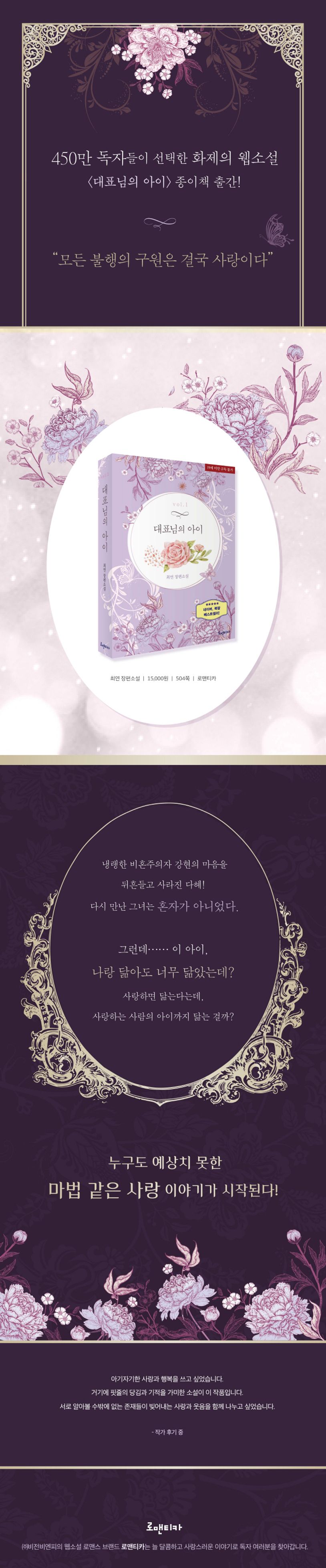 개성적인 캐릭터와 흡입력 있는 전개로 독자들에게 뜨거운 사랑을 받은 『대표님의 아이』가 오랜 기다림 끝에 종이책으로 출간되었다. 『대표님의 아이』는 네이버, 북팔 연재 즉시 로맨스 베스트에 오른 작품이다.