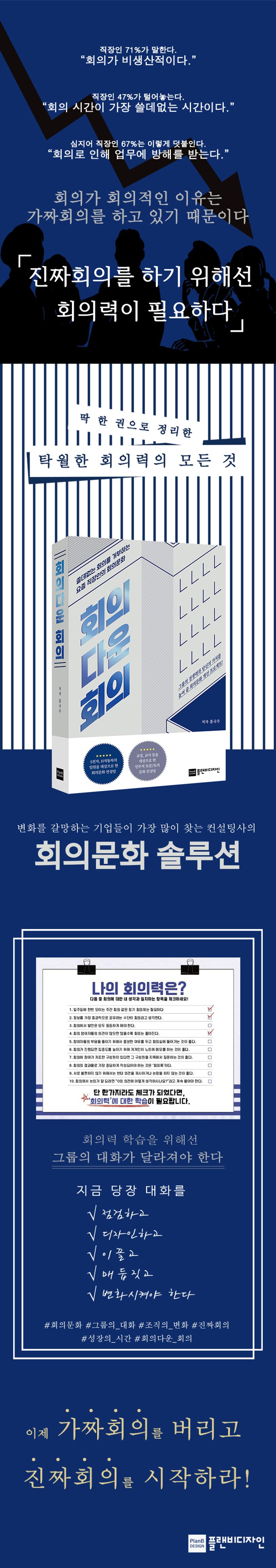 저자는 컨설턴트로서 대기업, 중견기업, 공공기관, 공기업 등 다양한 그룹의 회의 모습을 지켜봐 왔다. 그 결과 저자 역시 ‘이런 회의라면 하지 않는 편이 낫다’고 생각했고, 회의를 변화시키고자 수많은 고민을 했다. 그리고 그 결과를 바로 이 책에 담았다.