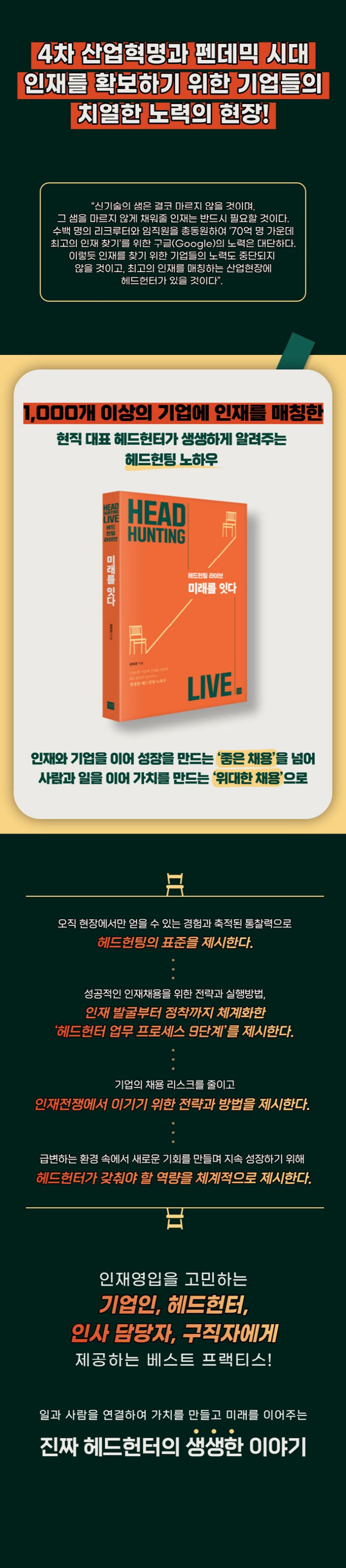《미래를 잇다: 헤드헌팅 라이브》에서는 IT, 금융, 반도체, 건설, 유통, 서비스 등 전 분야의 고객사 개발에서부터 사후 관리까지를 총괄하는 헤드헌터가 자신의 다양한 업무 활동을 9단계로 나눠 체계적으로 설명한다. 각 장의 끝에서 만날 수 있는 〈헤드헌팅 Live〉의 7개 사례는 1천여 건의 실제 헤드헌팅 중 독자들에게 도움이 될 만한 내용을 고르고 골랐다.