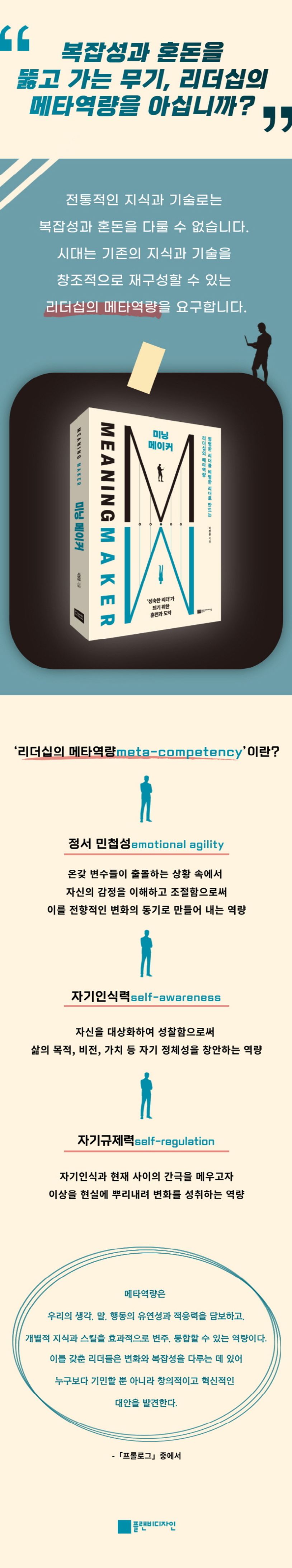 책 『미닝 메이커』는 평범한 리더를 ‘성숙한 리더’로 만드는 훈련과 도약에 관한 내용을 담고 있다. 수시로 상황이 급변하고 위기가 돌출하는 현대 사회에서 리더가 반드시 갖춰야 할 ‘메타역량(meta-competency)’이 무엇인지 상세히 소개한다. 자신이 어떠한 리더인지 끝없이 자문하고 성찰과 숙고를 통한 행동의 변화를 이끌어 내어, 조직 전체의 발전을 선도하는 ‘성숙의 리더십’이 무엇인지를 심도 있는 연구를 바탕으로 제시해 나간다.