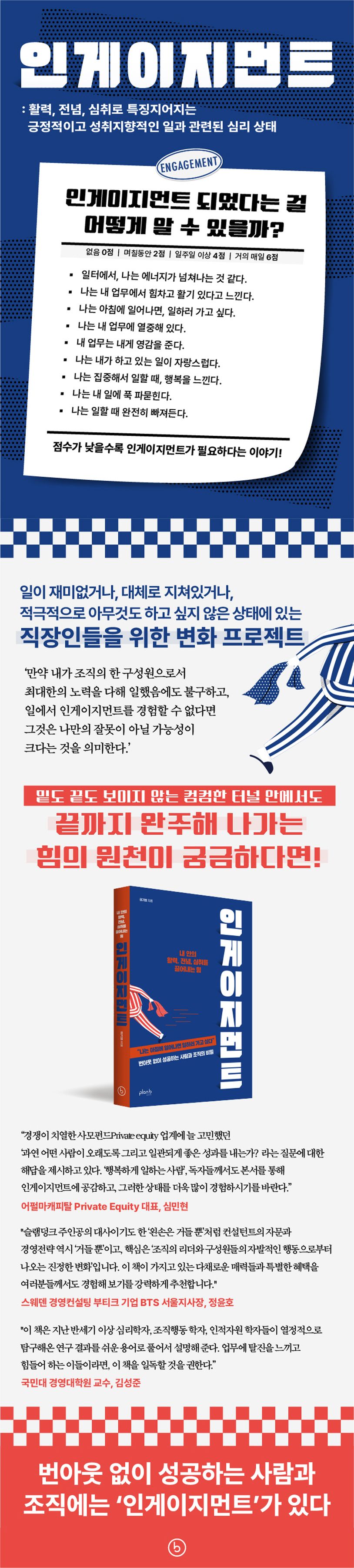이러한 힘듦 없이 긍정적이고 성취지향적인 상태로 일하고 싶은가? 그렇다면 책 《인게이지먼트》를 읽어야 할 때다. 책은 다음과 같은 내용으로 구성되어 있다.